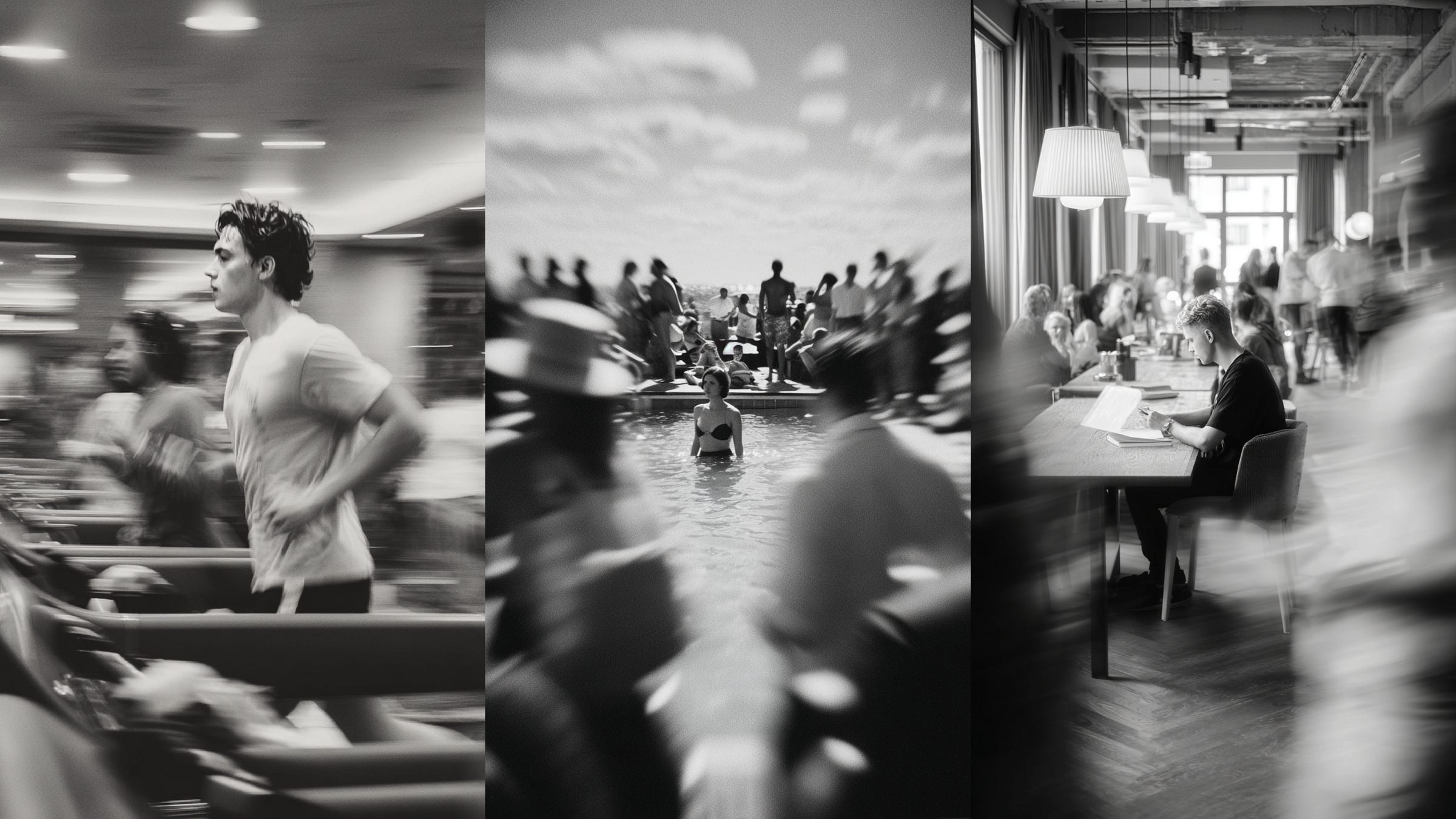 A coworking lounge or amenity deck? Filled with people carving out invisible personal bubbles inside a large, exposed volume.
